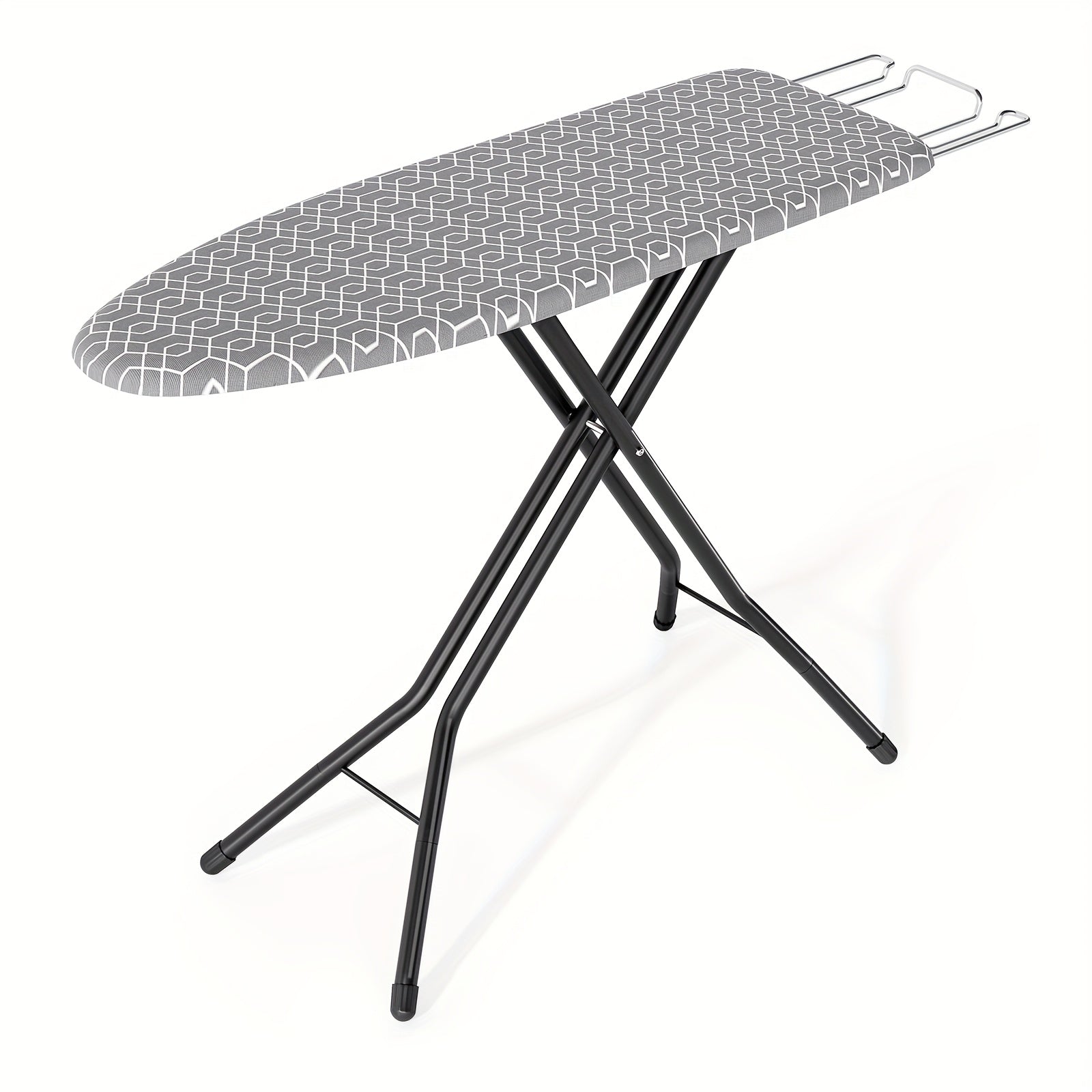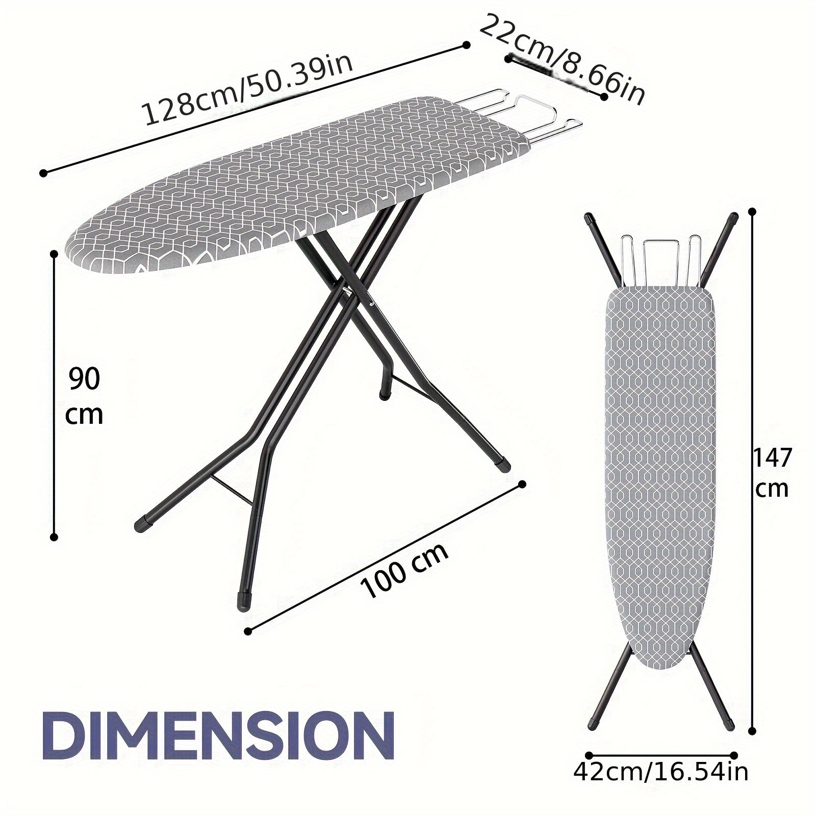 - Durable metal frame and sturdy ironing surface provide steady support for your garments of all sizes, while an integrated iron rest keeps your hot iron safely at hand and a heat-resistant cover safeguards your fabrics from scorch marks.